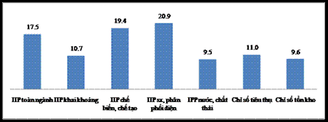 Xét mức tăng trong toàn ngành, có thể thấy ngành khai khoáng những thời kỳ trước thường giảm, nếu có tăng cũng rất thấp, thì tháng 1/2015 đã tăng 2 chữ số (17,5%); ngành công nghiệp chế biến, chế tạo chiếm tỷ trọng lớn nhất tăng khá cao; ngành sản xuất và phân phối điện (động lực của tăng trưởng công nghiệp) đạt mức tăng cao nhất (20,9%); ngành cung cấp nước, hoạt động quản lý và xử lý rác thải, nước thải tăng khá.