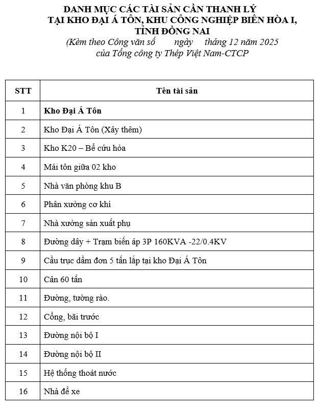 Tổng công ty Thép Việt Nam - CTCP kính gửi các đơn vị có năng lực phá dỡ và có nhu cầu thu mua tài sản trên địa bàn Khu công nghiệp Biên Hòa I, tỉnh Đồng Nai. Quý Công ty quan tâm và có nhu cầu thu mua lại tài sản thanh lý của Tổng công ty xin liên hệ khảo sát và gửi thư chào giá cạnh tranh (bằng văn bản, bỏ phong bì kín) gửi về Tổng công ty Thép Việt Nam - CTCP (thông qua Ban Tài chính Kế toán - Tổng công ty; địa chỉ số 91 Láng Hạ, phường Đống Đa, Thành phố Hà Nội) chậm nhất ngày 26/12/2025 để Tổng công ty xem xét, lựa chọn bán tài sản thanh lý nêu trên. Giá chào phải đảm bảo không thấp hơn giá khởi điểm.